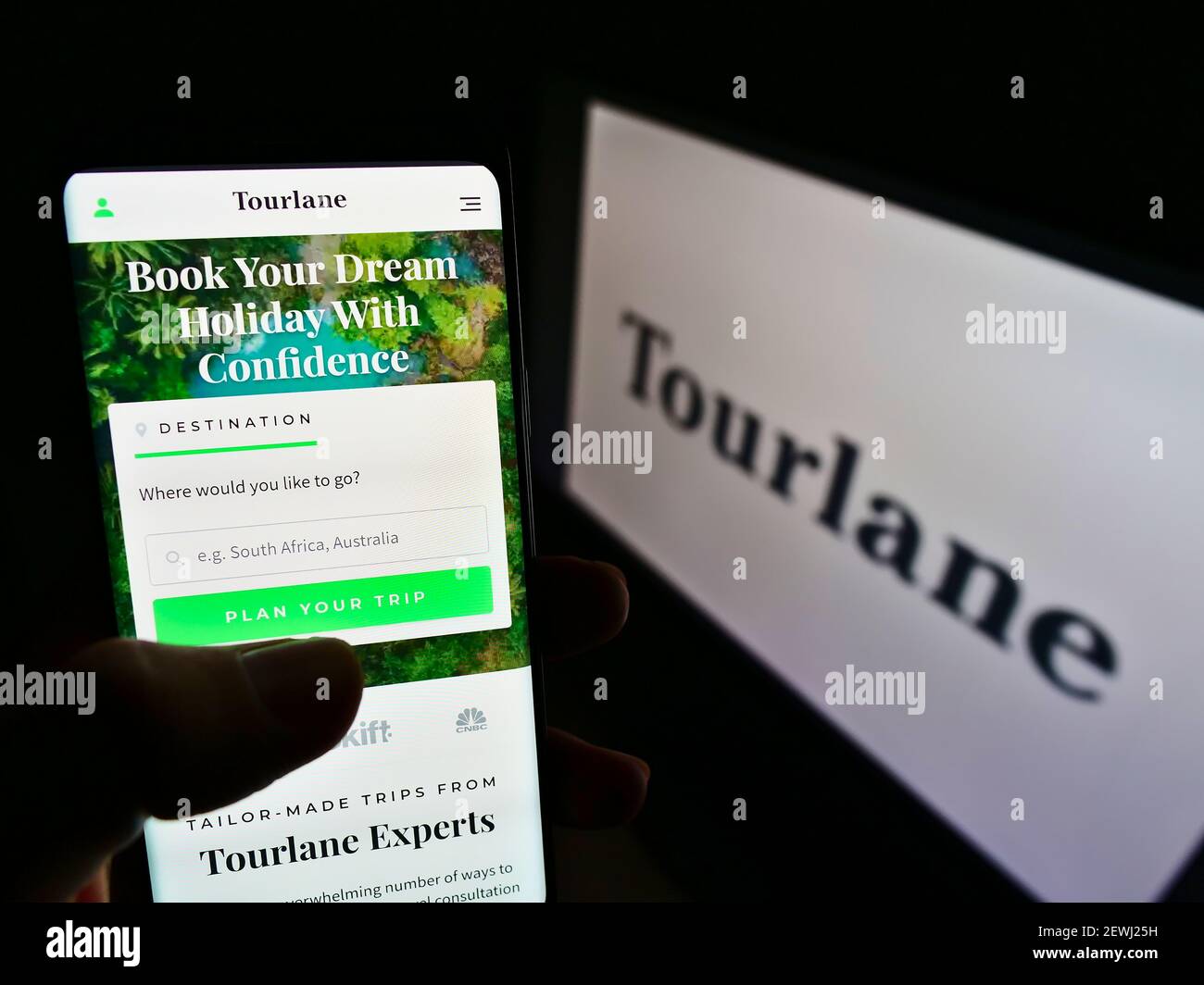Person Holding Smartphone With Website Of German Online Travel Agency Tourlane Gmbh On Screen In Front Of Logo Focus On Center Of Cellphone Display Stock Photo Alamy